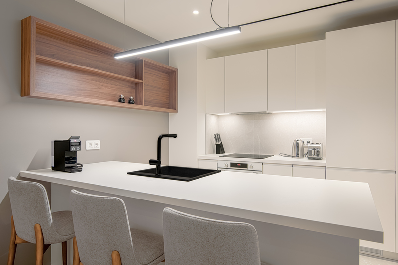 sleep. It provides an elegant and fully equipped kitchen with a coffee machine and a modern